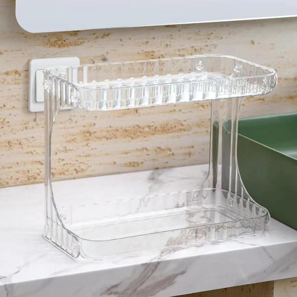 Prateleira dupla em acrílico ideal para organizar itens de banheiro como shampoos cremes e cosméticos. Design portátil e montável instalação sem furos material resistente